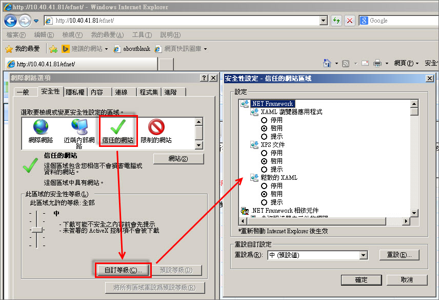 2.設定「信任的網站」自訂等級的安全性設定: