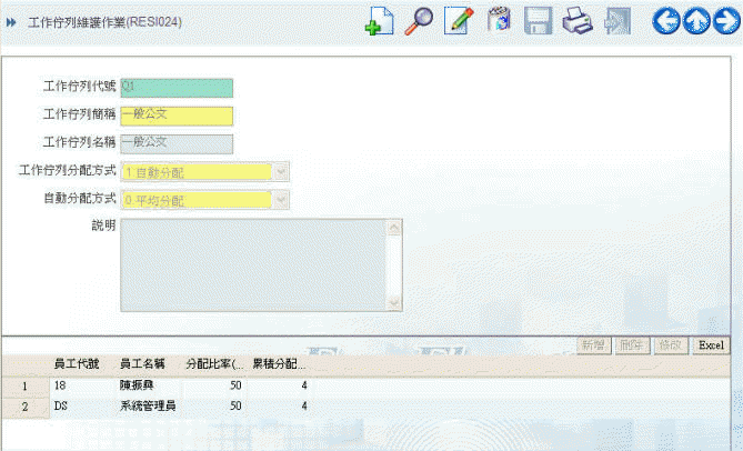 2. 您可透過「工作佇列維護作業(RESI024)」隨時調整工作佇列分配方式及分配週期,以平衡工作佇列中員工之工作量。