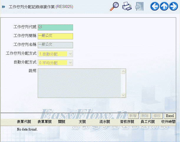 1. 工作佇列為流程關卡處理角色之一,在表單流程運作中,當解析流程關卡為工作佇列時,會產生許多工作佇列分配記錄,例如:某張表單於何時分配予某一工作佇列中某員工,系統會將其一一詳細記錄,而您可以利用本維護作業查詢分配記錄,了解工作佇列之分配狀況及各員工到目前為止的工作量。