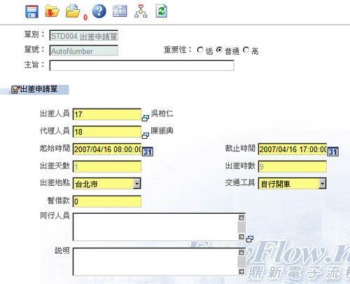 當系統上線之後,所有出差申請作業,您都可以利用『出差申請單』提出出差申請,透過使用電子表單方式提出出差申請,可以為您節省紙上作業所浪費的人力及時間。