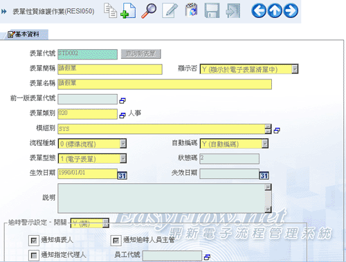 使用表單精靈功能中製作的電子表單,為了具備流程能力,結合EasyFlow來運作,必須在本維護作業中定義此表單的性質(如以下"欄位說明"),此張表單必須有完整的性質資料,才能結合EasyFlow正常運作。
